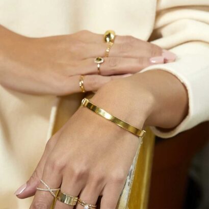 A high polished hinged bracelet clasps around the wrist, secured with a custom box clasp and button closure. At 6mm wide, the bracelet is everyday wearable boldness and offered in the 3 classic colors of Rose, White, or Yellow. Available in S/MD or MD/LG, this hidden logo piece is an instant AURATE classic.