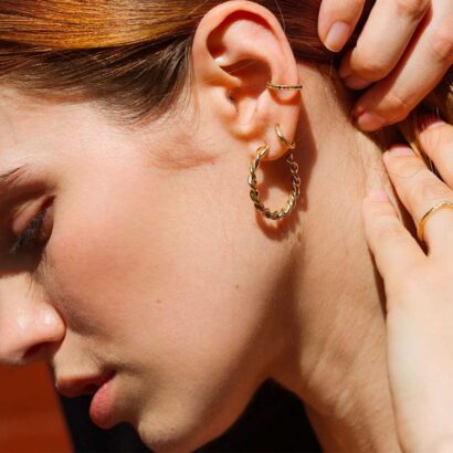Cross your fingers, your heart, your legs, and your gold. We intertwined two solid gold hoops to form this super statement earring.