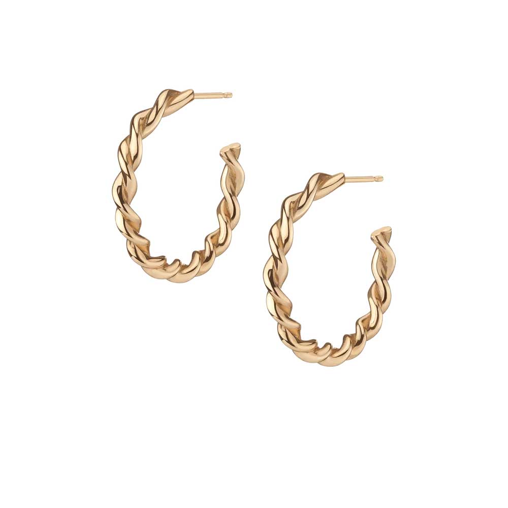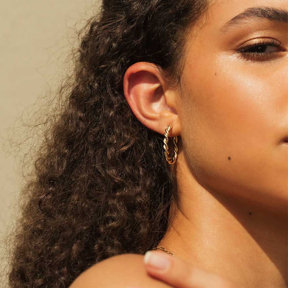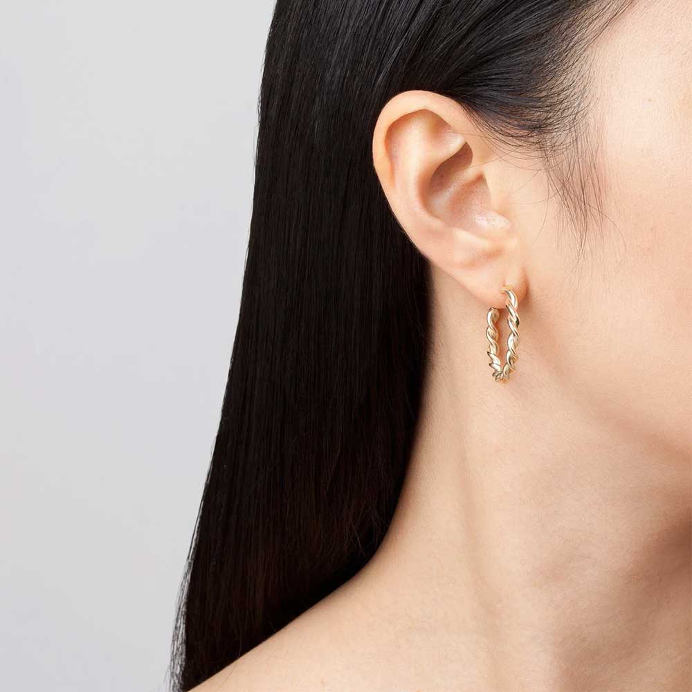 Gold hoop earrings featuring a bold spiral twist, secured by a post and wignut.