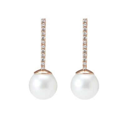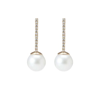 A pair of post-set freshwater pearls hang from a row of round brilliant-cut diamonds, prong-set in gold, suspended from ear posts and secured with a wing nut closure.